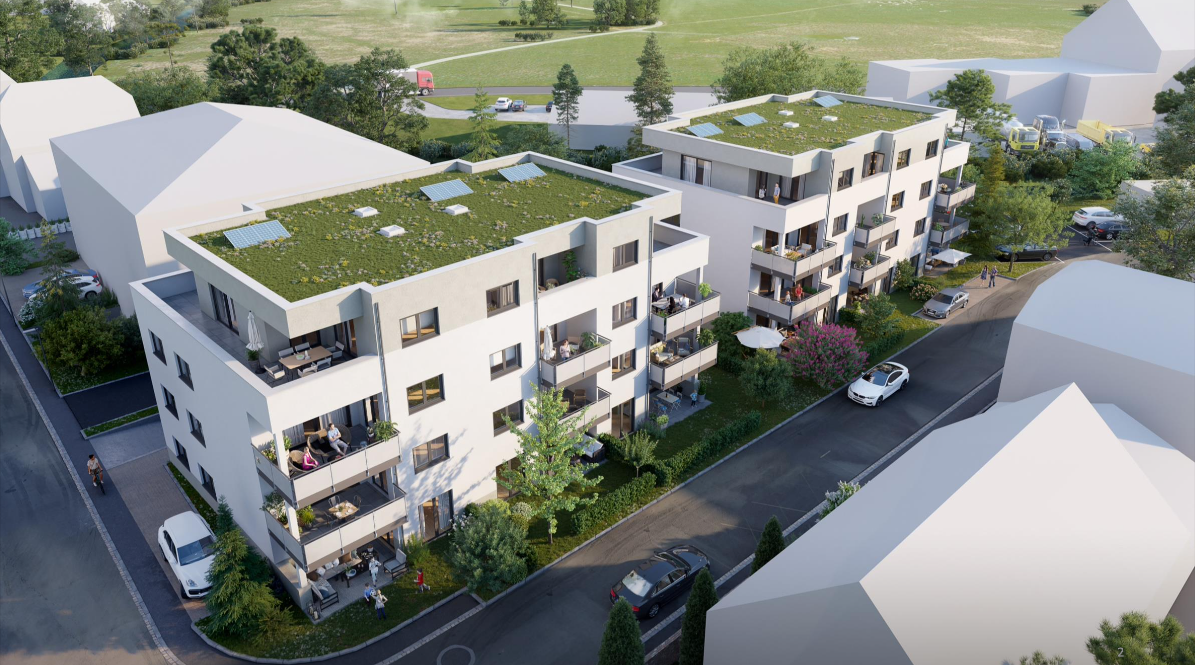 Exponiert ist man trotzdem nicht, da das schlanke Profil das Gros der Fensterfronten nach Süden und Norden öffnet. Hinter den Stellplätzen finden wir auf der Nordseite auch die zwei Hauseingänge und den Weg in den hinteren Garten- und Spielbereich im Nordosten.