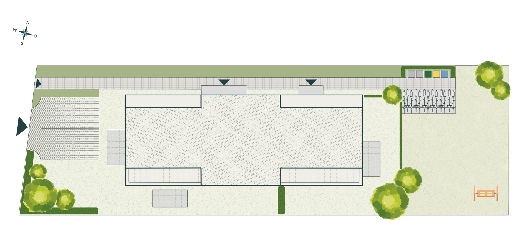 Dort liegen Abfallentsorgung und Fahrradstellplätze – und um die Ecke der Südgarten mit seinen großzügigen Sonnenterrassen und -Balkonen. Die Bepflanzung erkennen Sie an den eingezeichneten Baumkronen.